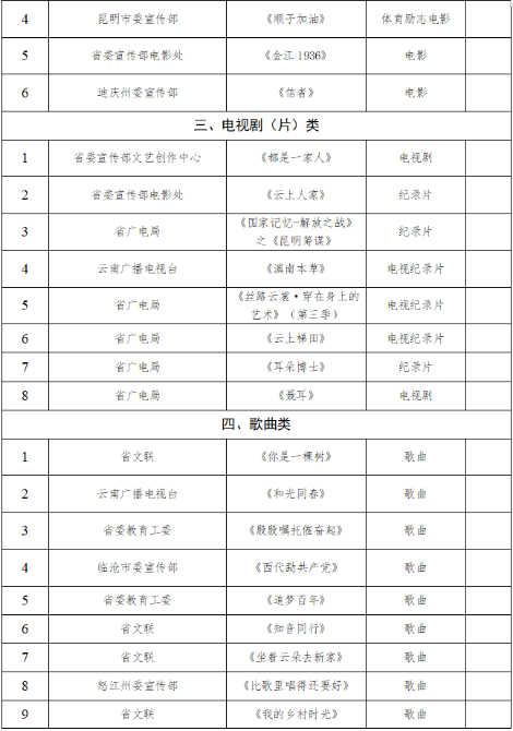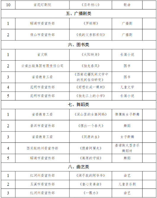 根据《中共云南省委宣传部关于做好第十届“云南文化精品工程”奖评选工作的通知》及有关规定,对各单位申报作品组织专家和相关人员认真进行初评和复评,为确保评奖公平公正,现将拟获奖作品予以公示: