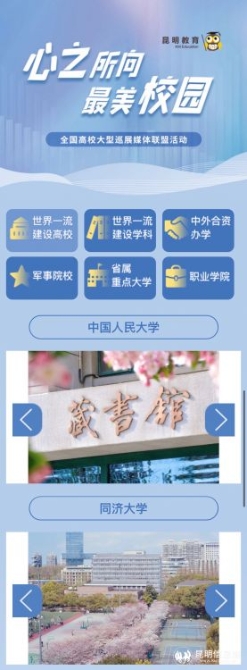 “心之所向 最美校园”大型展播网络专题共设立“世界一流建设高校”“世界一流建设学科”“中外合作办学”“军事院校”“省属重点大学”“职业学院”六大栏目,集中展播近百所高校图片、短视频,包括云南大学、云南师范大学等云南本土高校的作品也参展其中,为即将开启大学生活的莘莘学子展现不同高校各具特色的校园风采。