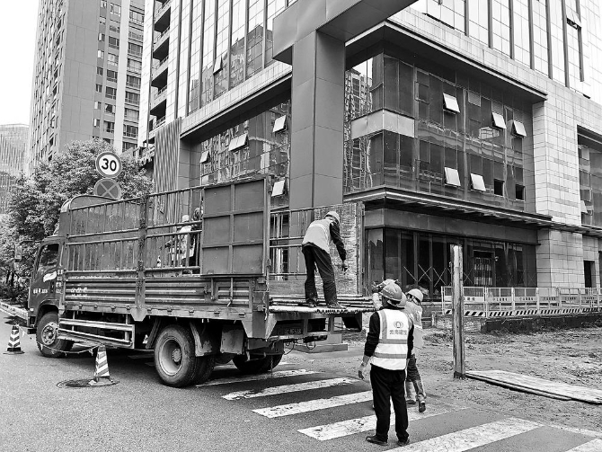 当天上午,记者来到壹号广场项目A3地块一期,几名工人正有序开展工作。A3地块一期室外的杂草及建筑垃圾已被清理,原不符合要求的老旧围挡也被更换,并安装了标准化施工围挡及喷淋设备。其他工作也在有序推进。