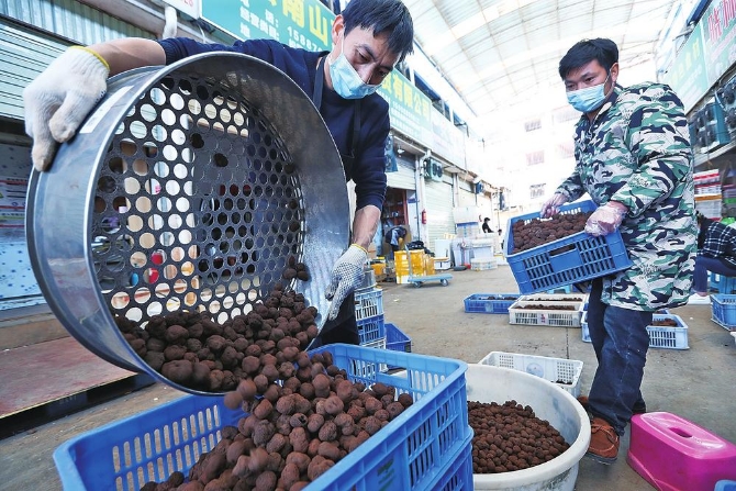 木水花野生菌交易中心,商户正在分拣黑松露 本报记者 杨峥 摄