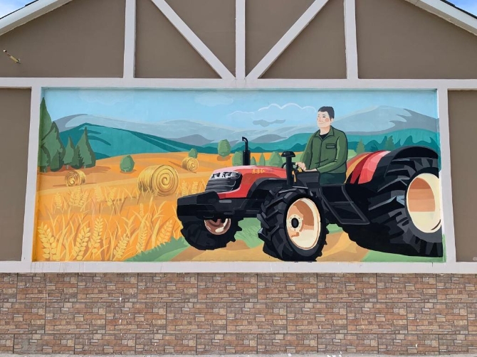 在西口村党群服务中心,几十面墙壁满是各色墙绘,艳丽而灵动,灰头土脸的老房子一下“活”了起来。这些作品都是近几年创作的。尤其在2021年,西口村举行了第一届阿尔山市乡村墙绘艺术大赛,上海大学上海美术学院、浙江艺术职业学院、广州美术学院附中等8所院校,近千人次来到西口村,长达数月进行墙绘创作,总创作面积超1000平方米。