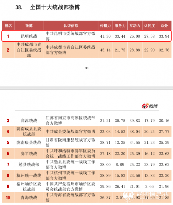 6686体育讯 记者周璐 日前,2022年第一季度政务微博影响力报告发布,昆明统战微博上榜“全国十大统战部微博”并位列榜首。