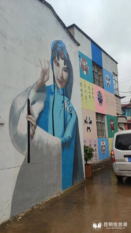 原来,从1926年起,滇剧由昆明传入石庄村,距今已有90余年历史,石庄滇剧2009年被列为昆明市级非物质文化遗产保护名录。2021年4月份开始,石庄村开始对村内民房外立面墙体进行彩绘,巷道涉及的村民都愿意给自家的墙面“化个妆”。全村墙体彩绘达8面墙,总面积240平方米,彩绘内容包括滇剧历史,著名滇剧曲目,生、旦、净、末、丑及农村现有的风貌等,整个彩绘于2021年5月底完工,这条“滇剧巷”彩绘墙成为石庄村最大的文化特色之一。