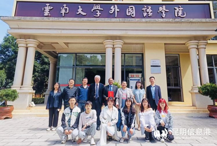 云南大学外国语学院领导、师生与苏噶特先生合影留念