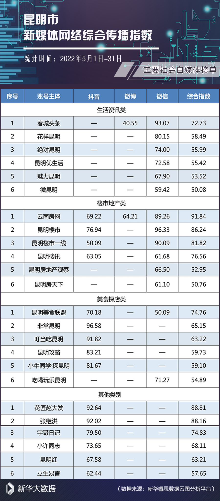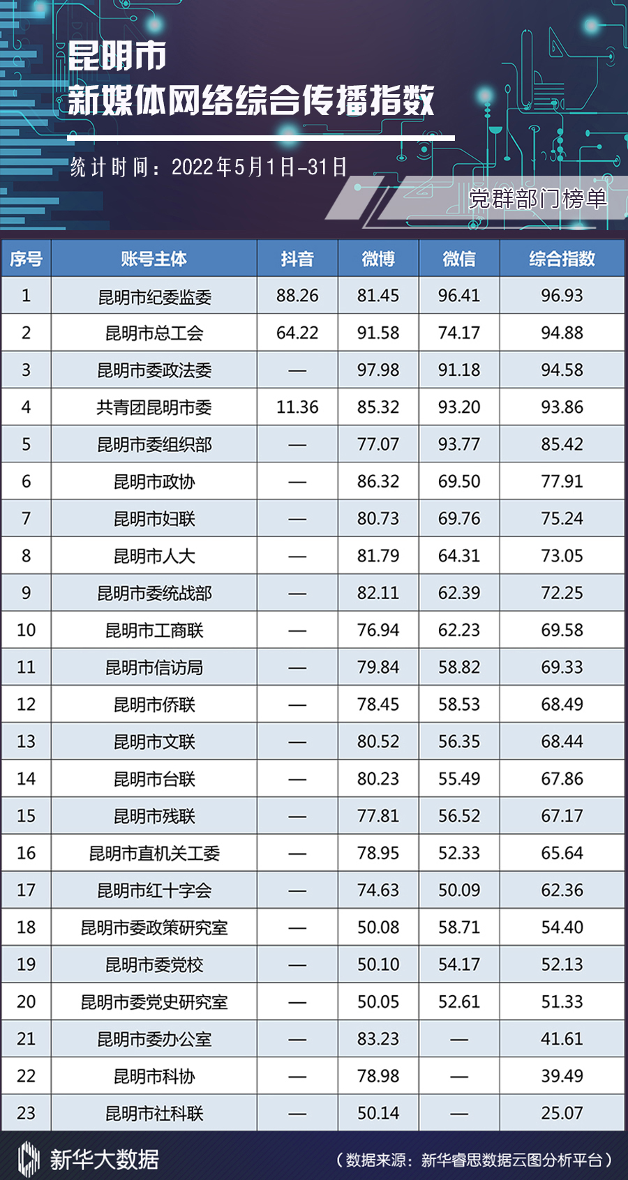新华网昆明6月27日电(刘奕)日前,2022年5月昆明市新媒体网络综合传播指数榜单(以下简称“榜单”)发布。在“党群部门”榜单中,新增昆明市纪委监委、共青团昆明市委抖音数据。