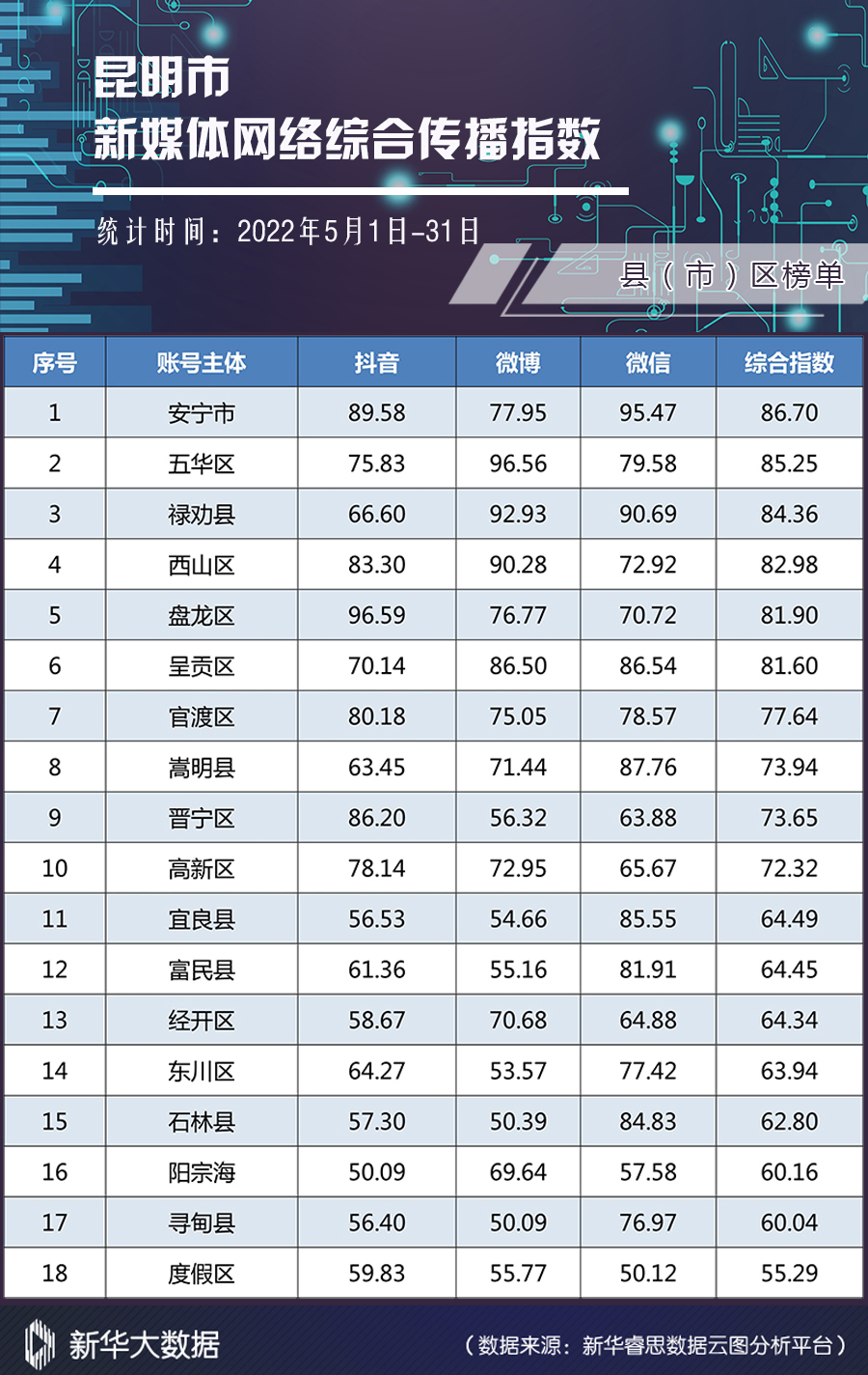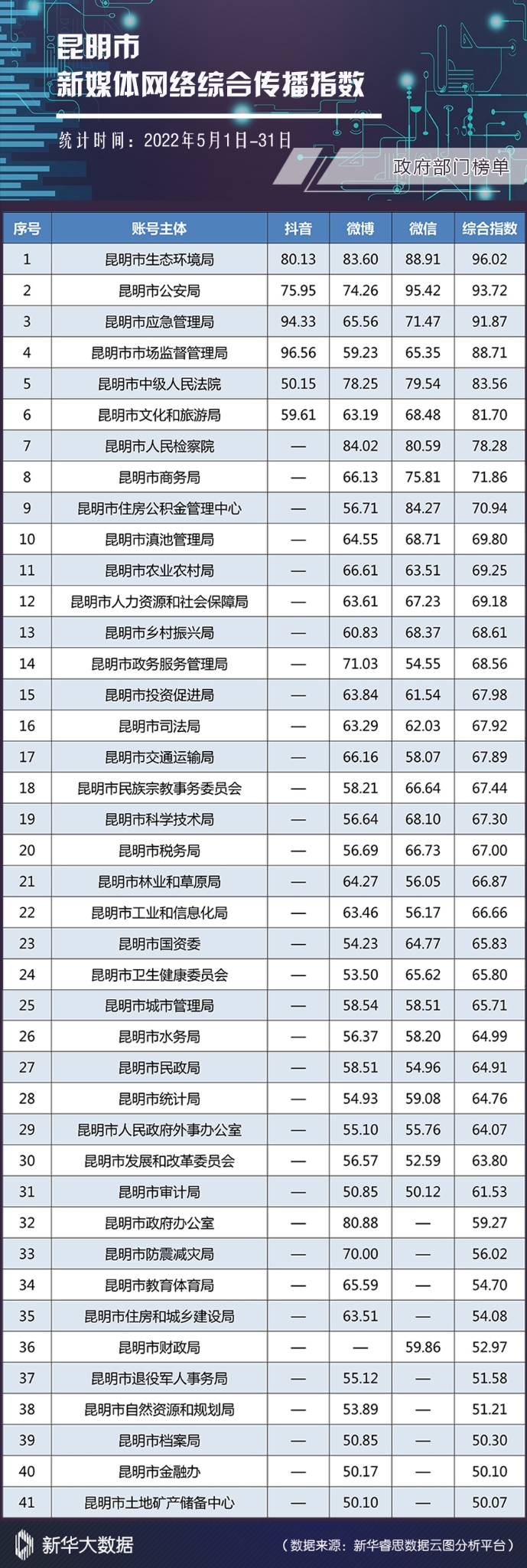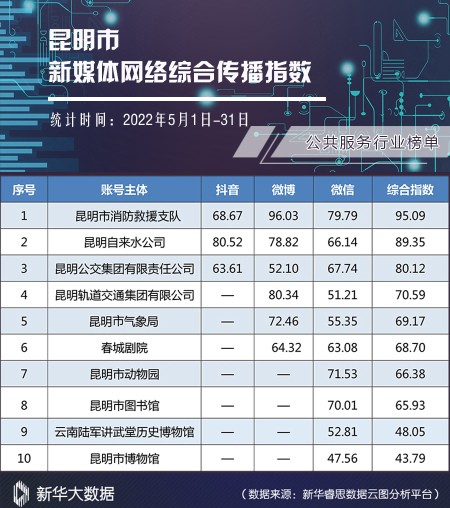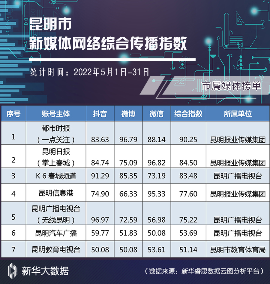 榜单由昆明市委网信办指导,昆明市网络文化协会发布。榜单依托新华大数据分析系统,从账号活跃度、内容创新力、账号互动性、传播扩散力四个维度对各单位(组织)认证的官方新媒体进行综合全面分析,客观反映昆明市新媒体网络综合传播力和影响力。(完)