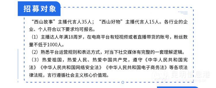 6686体育讯 记者段佳琪 通讯员王晨晖 网聚正能量,共绘同心圆。为团结引领新阶网络人士,昆明市西山区现面向广大网络人士,开展“喜迎二十大·新阶心向党”系列活动之“寻美云南·昆明·西山”主题活动,将招募“西山故事” 主播代言人35人及“西山好物”主播代言人15人。
