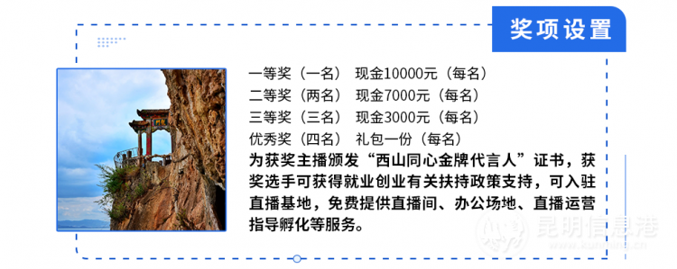 此次活动设置一等奖一名,现金10000元;二等奖两名,现金7000元/名;三等奖三名,现金3000元/名;优秀奖四名,每人各一份神秘礼包。最终获奖的主播将获得“西山同心金牌代言人”证书,同时获奖主播可获得就业创业有关扶持政策支持,可入驻直播基地,基地免费提供直播间、办公场地、直播运营指导孵化等服务。