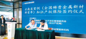 6686体育讯(昆明日报 记者郭曼)6月28日,在位于高新区的昆明市知识产权服务业集聚区,中国平安财产保险股份有限公司云南分公司与贵研铂业股份有限公司子公司——贵研工业催化剂(云南)有限公司签订了稀贵金属新材料专利保险协议,标志着全国首单稀贵金属新材料专利保险诞生,全省知识产权保险实现“零的突破”。