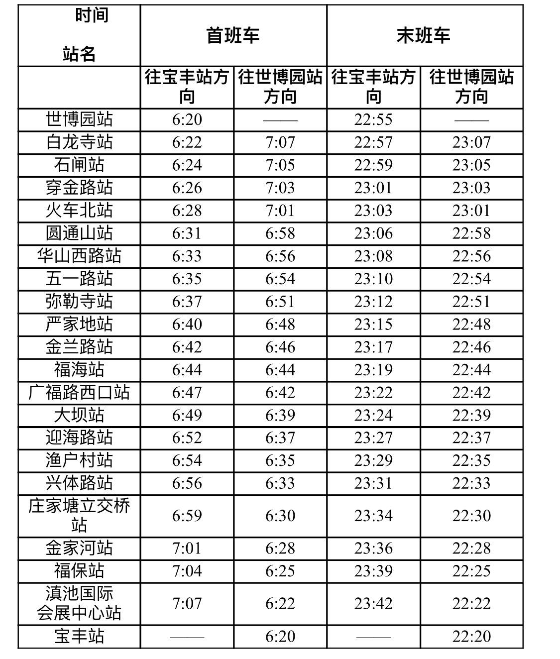 世博园站至宝丰站方向为:6:20~22:55
