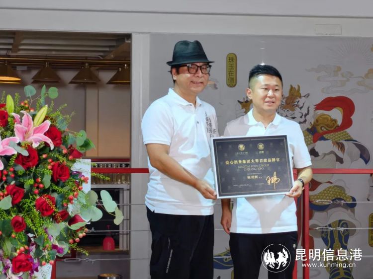 爱心酒业集团董事长王玮(右)为大犟品牌创始人鲍利辉(左)颁发“大犟首席品牌官”聘书