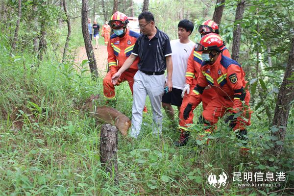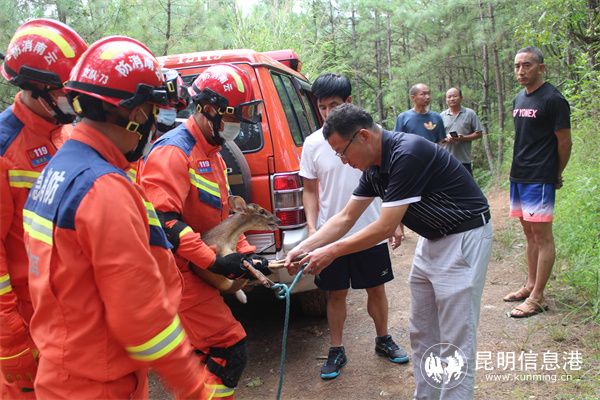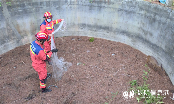 18时28分,救援人员到达现场,经观察及询问报警人得知误入水池的赤麂前肢有明显裸露外伤特征。现场蓄水池深约2米,无水,指挥员首先组织2名消防救援人员沿软梯下到水池中,为防止赤麂受到惊吓致二次伤害,消防救援人员利用渔网进行抓捕,待抓到后再绳子将前后肢进行捆绑固定,在经过10分钟的救助后,赤麂被成功救出水池。