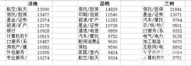 北京以14252元/月的平均招聘薪酬,位列第二。北京的情况与上海类似,二季度平均招聘薪酬环比上涨6.6%,生物医药、半导体、汽车等产业的发展带动这类岗位薪酬上涨一成以上。昆明以8500元的平均招聘薪酬,位列本季度全国38个核心城市的第30名,其中,信托/担保行业的平均招聘薪酬达到14829元/月。