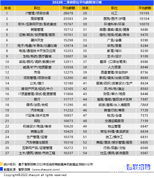 今年一季度经济开局良好,进入二季度后,疫情散发对企业经营影响明显,招聘需求随之收缩,但平均招聘薪酬不降反升。智联招聘数据显示,二季度全国38个核心城市平均招聘薪酬为10341元/月,比一季度的10014元/月上涨3.3%。二季度招聘薪酬中位数和众数也有明显上升,其中,薪酬中位数为8251元/月,较上季度上涨252元,众数为6001元/月,环比上涨1000元。从往年规律来看,每年一季度是招聘求职旺季,市场上岗位类型相对分散,平均招聘薪酬小幅下降,二季度会有环比上升;另一方面,疫情下仍在招的更多是刚需人才和核心业务岗位,薪酬水平往往较高,于是拉动全国招聘薪酬上涨。