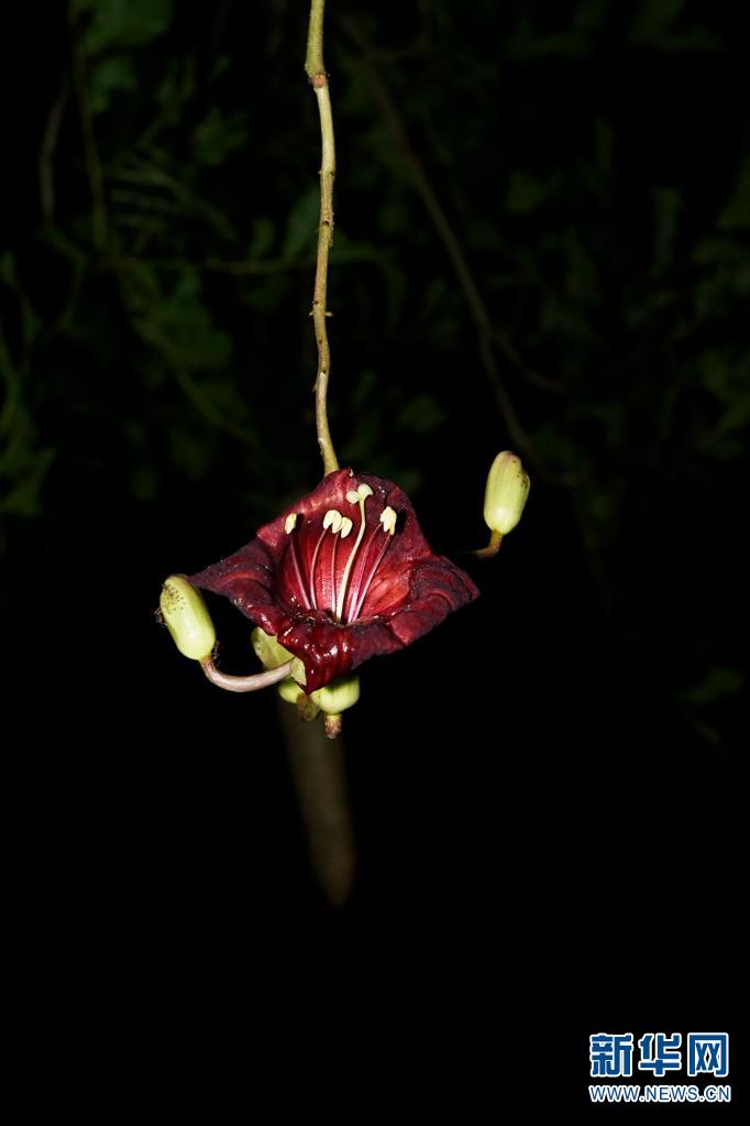 吊瓜树。花朵紫红色,宽钟状,可由夜间活动的蛾类或蝙蝠传粉(摄于6月21日)。新华网发(莫海波/摄)