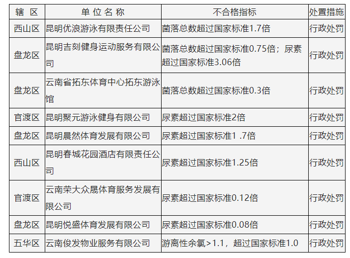 游泳池水水质检测项目为细菌总数、大肠菌群、尿素、游离性余氯、浑浊度、PH值等6项指标。针对10月份抽检不合格6家游泳场所,昆明市卫生健康委员会综合监督执法局将按照《游泳场所卫生规范》要求,依据《公共场所卫生管理条例实施细则》规定,对不合格游泳场所进行行政处罚。各游泳场所要根据自身存在的问题,及时找出游泳池水管理薄弱环节,加强水质处理管理,及时整改,确保游泳池水质符合国家卫生标准和要求。
