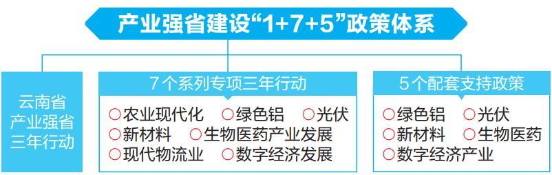 为深入贯彻落实省第十一次党代会精神,加快推进产业强省建设,近期,我省先后印发实施云南省产业强省三年行动,农业现代化、绿色铝、光伏、新材料、生物医药产业发展、现代物流业、数字经济发展7个三年行动,以及绿色铝、光伏、新材料、生物医药、数字经济产业5个配套支持政策,形成了以产业强省三年行动为统领,以7个系列专项三年行动、5个配套政策为支撑的产业强省建设“1+7+5”政策体系。