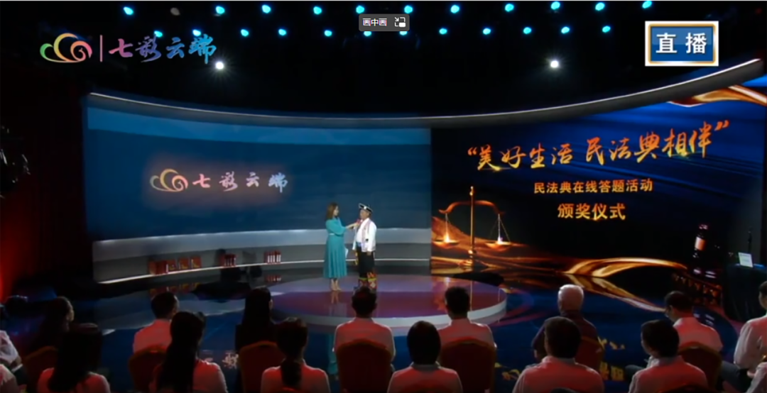 2021年8月6日,“美好生活·民法典相伴”民法典在线答题活动颁奖仪式在昆明举行。活动持续52天,超500万人次参与活动,在全省掀起了民法典学习热潮。图为现场采访坚守普法一线37年的基层普法人李学平。