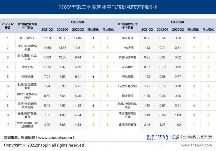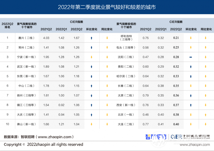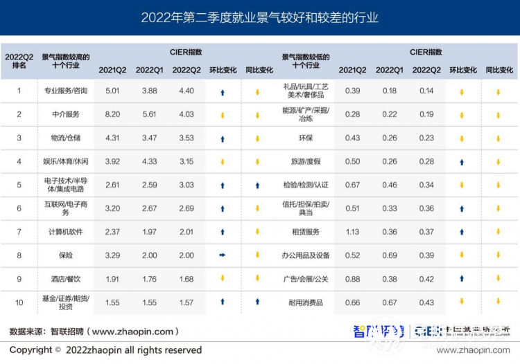 近日,中国人民大学中国就业研究所与智联招聘联合推出2022年二季度《中国就业市场景气报告》。其中指出,二季度全部求职申请人数增速高于全部招聘需求人数增速,就业市场景气指数(CIER)从一季度的1.56下降至1.35,就业竞争趋向激烈。