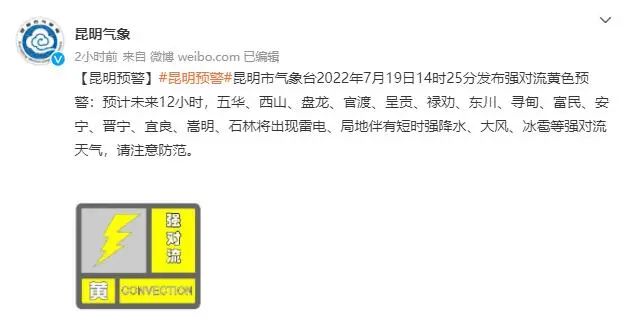 7月19日14时25分,昆明市气象台发布强对流黄色预警:预计未来12小时,五华、西山、盘龙、官渡、呈贡、禄劝、东川、寻甸、富民、安宁、晋宁、宜良、嵩明、石林将出现雷电、局地伴有短时强降水、大风、冰雹等强对流天气,请注意防范。