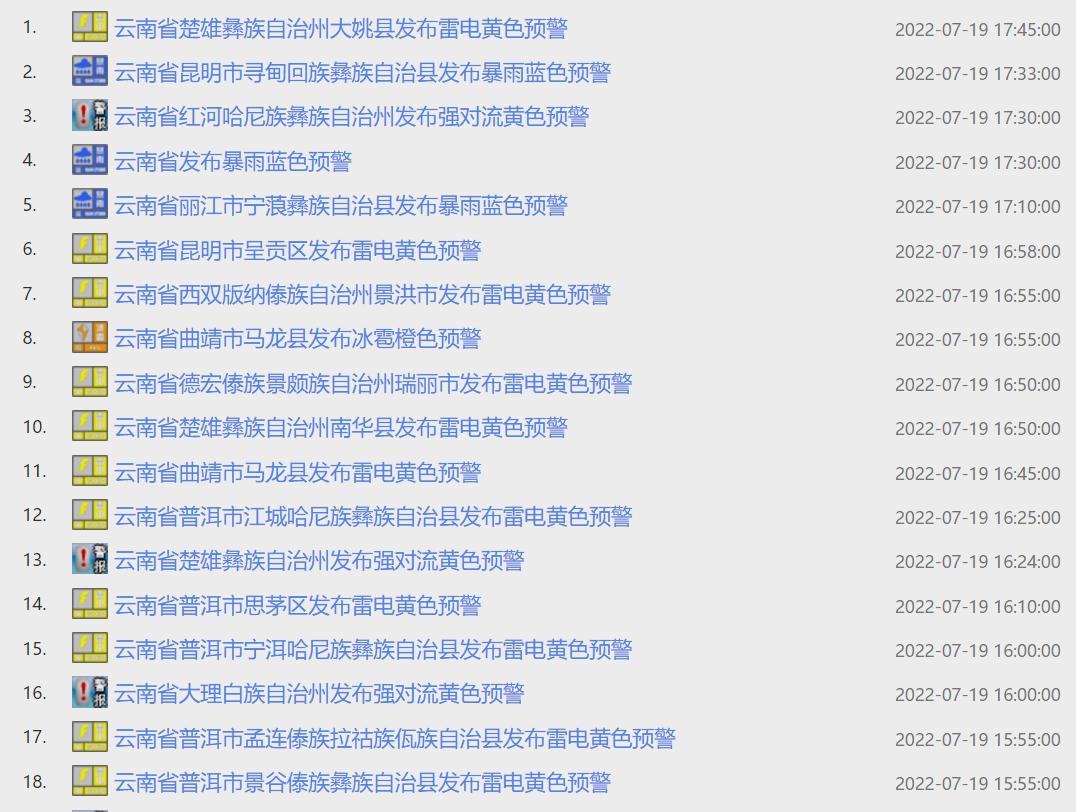 截至19日下午5点45分,云南各地已发布57条预警信息: