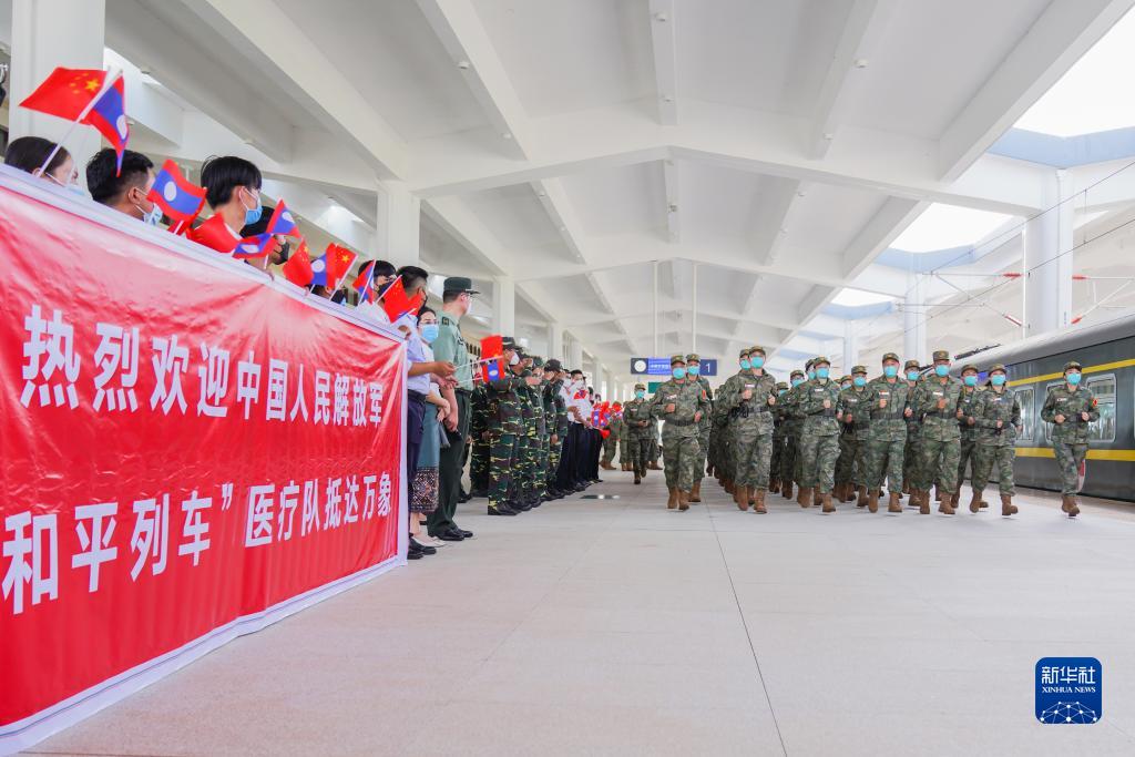 老挝国防部、老挝人民军总后勤部代表,我军援助老挝医学专家,老中铁路有限公司人员等在万象站迎接医疗队一行。欢迎人员挥舞中老两国国旗,手持“热烈欢迎中国人民解放军‘和平列车’医疗队抵达万象”横幅欢迎医疗队抵达。