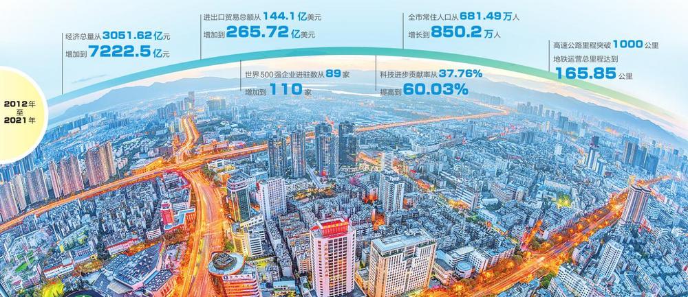 加快构建“老城焕新、新城崛起、新区发力、城乡融合”的空间格局,城市框架全面拉开。2012年至2021年,主城区建成区面积从397平方公里扩大到459平方公里,全市常住人口从681.49万人增长到850.2万人。