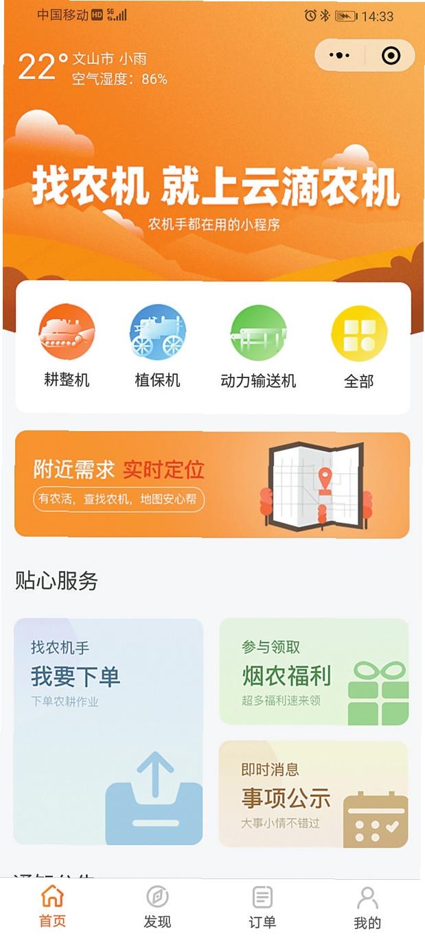 “云滴农机”和“空中滇农”是文山州局(公司)联合北京航空航天大学云南创新研究院研发推广的农机机耕服务以及无人机植保服务微信小程序,通过移动互联网技术搭建起了烟农与机耕手及无人机飞手的桥梁。