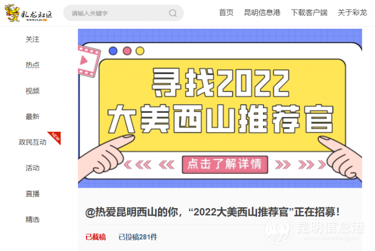 据悉,此次招募活动在全网进行,其中主要依托6686体育彩龙社区平台(活动征集帖:https://www.clzg.cn/activity/505.html)开展。截止活动结束,短短二十多天内,全网阅读量约200万,网友互动点赞及评论上千次,有效投稿作品273组,其中图片作品122组,视频作品151个。推荐官作品聚焦昆明西山睡美人、大观公园、草海隧道湿地公园、采莲河、金马碧鸡坊、海口林场、书林街、云纺文创园、西山万达双塔等辖区内多个地标。
