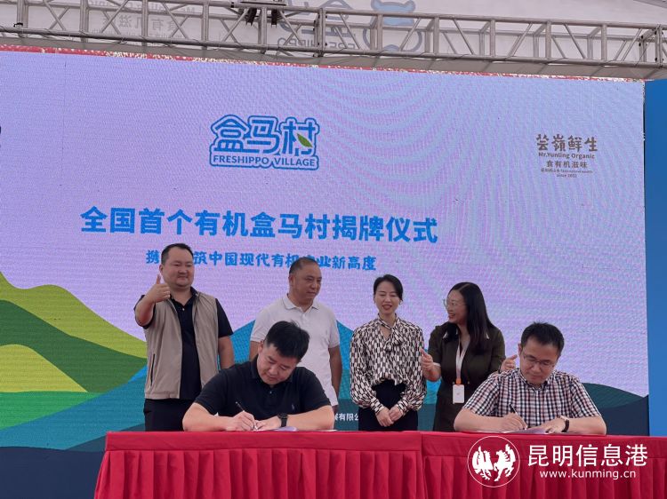 仪式上,盒马集团蔬菜采购总经理张进林与芸岭鲜生农业发展有限公司全国运营总监李浩代表双方签订2023年订单,昆明市农业农村局副局长念承文与盒马区域总经理林桂福代表双方签订乡村振兴框架战略合作协议。随后,与会领导共同为全国首个“盒马有机村”揭牌。