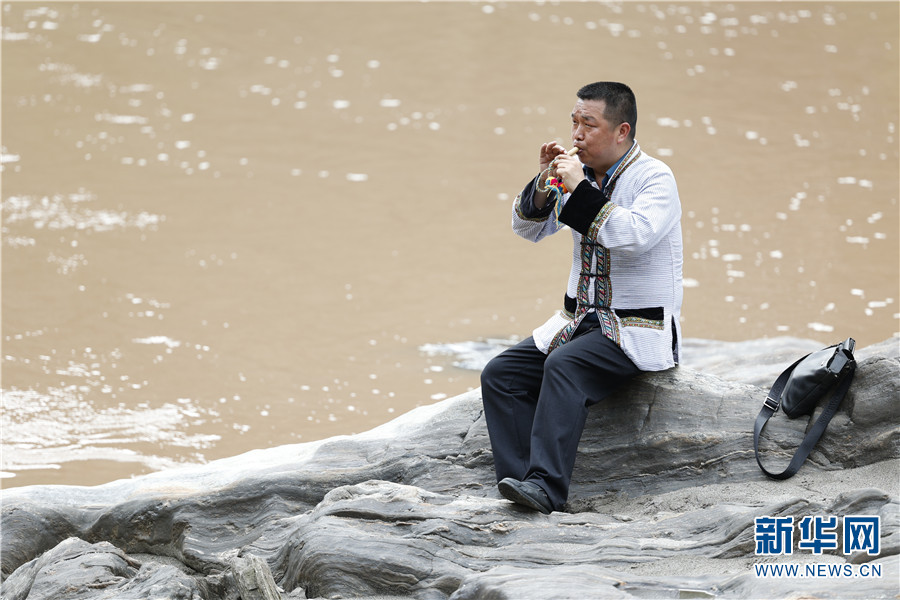 马金华在怒江边吹奏傈僳族乐器笛哩图。新华网 李浩 摄