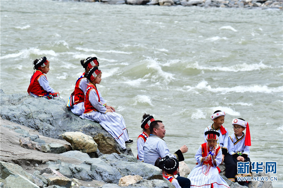 马金华与阿谷色少儿合唱团来到怒江边采风。新华网 郭康 摄