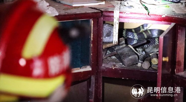 14时43分,消防救援人员到达现场,经现场询问和侦查,发现一条2米左右,全身呈暗褐色,头部扁平的蛇盘踞在柜子里,不停的吐着信子,初步判定为有剧毒的眼镜蛇。