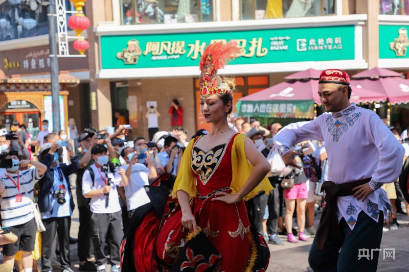 大巴扎步行街中央舞台新疆歌舞吸引游客观赏(央广网记者 罗成 摄)