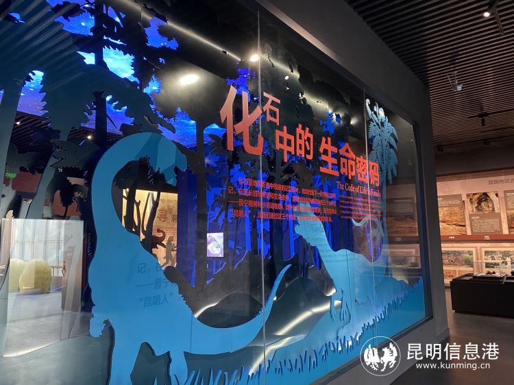 新开展的“化石中的生命密码”部分展出较为完整的双脊龙头骨、恐龙足迹等化石展品,在展览开始的地方还设置了发现恐龙化石现场的复原场景,场景中有两只恐龙骨架,一只为云南龙,另一只为双脊龙,双脊龙与云南龙身体相互垂直于一处被考古发现,考古人员猜测可能是双脊龙袭击云南龙时两败俱伤而形成的此景象。在“寻根溯源扣向未来”展区中,龙潭山古人类头骨化石为国家一级文物,为了观众能够更好地观察头骨,展台内放置头骨为复制品。展览内所有可见剪影均通过专家的科学指导制出,整个展览无论是装饰、展柜还是展板都能方便前来参观的观众更深入地了解相关知识。