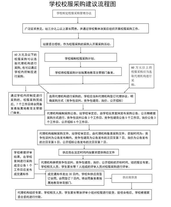 第六条 学校采购校服可自行采购或委托第三方机构代为组织采购。校服采购时,应当充分听取学生及家长意见,学校或第三方机构参照政府采购等相关法律法规开展校服采购工作。具体采购流程图如下: