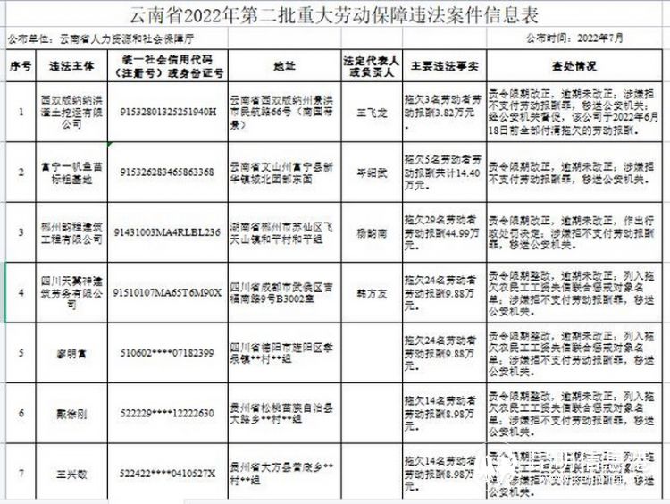 6686体育讯 记者江枫 近日,云南省人力资源和社会保障厅公布了今年第二批重大劳动保障违法案件,共7件,涉及4个用人单位和3个自然人。