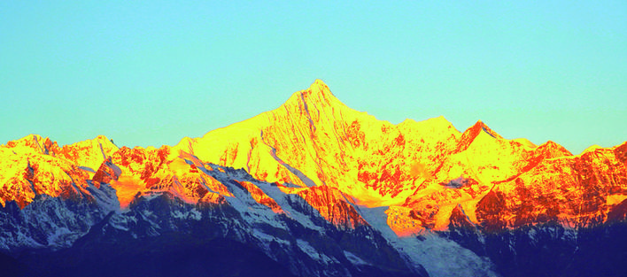 梅里雪山是位于西藏察隅县东部与云南迪庆藏族自治州德钦县境云岭乡西部的一座南北走向的庞大雪山群,全长有150公里。它是藏传佛教四大神山之一。由于气候原因,梅里雪山常年笼罩在雪幕和云层里。难得一见的“日照金山”景观往往发生在晴日的凌晨,太阳光越过云层阻隔照射到雪山顶上,然后逐渐扩大,形成绝美的“日照金山”奇观,持续20分钟左右,最后雪山整体变白,在阳光下熠熠生辉。