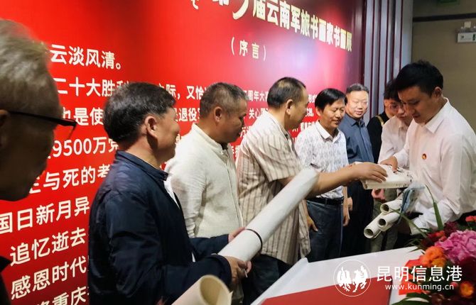 省人大常委会原常务副主任晏友琼,云南省军区原司令员黄光汉,云南省武警总队原政委王永银,四川省军区原副政委李立中,云南省文联党组书记、主席李勇,昆明市退役军人事务局党组书记、局长朱伟,著名军旅书画家钟开天等,参加了书画展开展仪式。