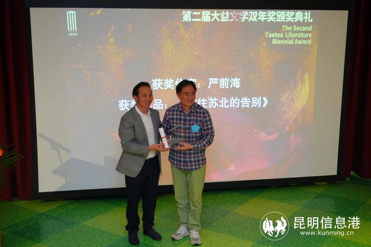 严前海(右)获得第二届“大益文学双年奖”
