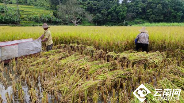 割稻谷、拉谷船、打稻穗、装口袋.......村民们默契配合,挥汗如雨,辛苦劳作的同时,也享受着丰收的喜悦。元阳县牛角寨镇大顺寨村民卢建财告诉记者,由于大顺寨村海拔比较低,这几天稻谷已经成熟了,每家每户都忙着出来采收稻谷,我家今年是栽了4亩多,收成比去年、前年都增加了。