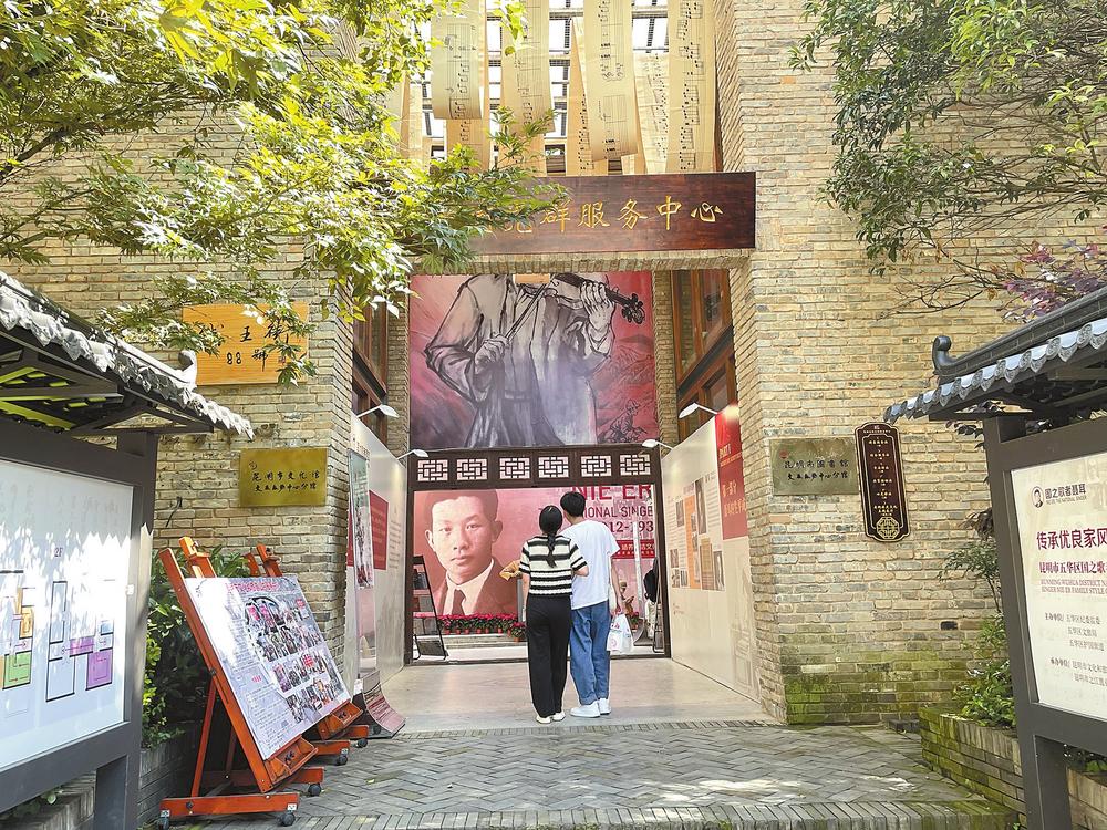 近日,昆明市文化和旅游公共服务中心承办了五华区国之歌者聂耳家风文化展。院落中布满了富含聂耳元素的装饰,部分空间也被改造为展厅,为游客提供了阅读、看戏、听讲座以及了解“聂耳和国歌的故事”的机会。