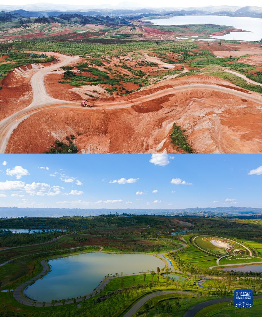 拼版照片:上图是云南省弥勒市太平湖森林小镇施工前景象(资料照片);下图是云南省弥勒市太平湖森林小镇(无人机照片,2018年11月10日摄,李昱廷摄)。 新华社发