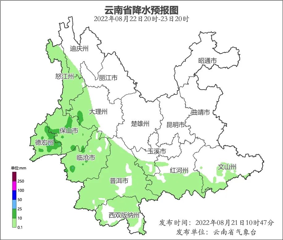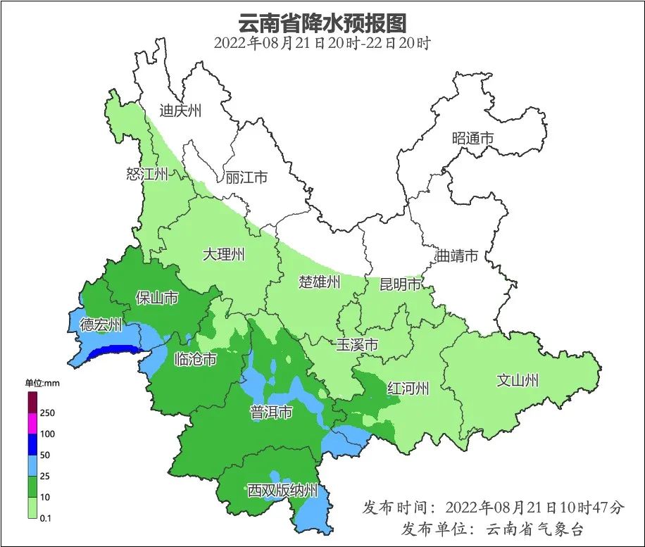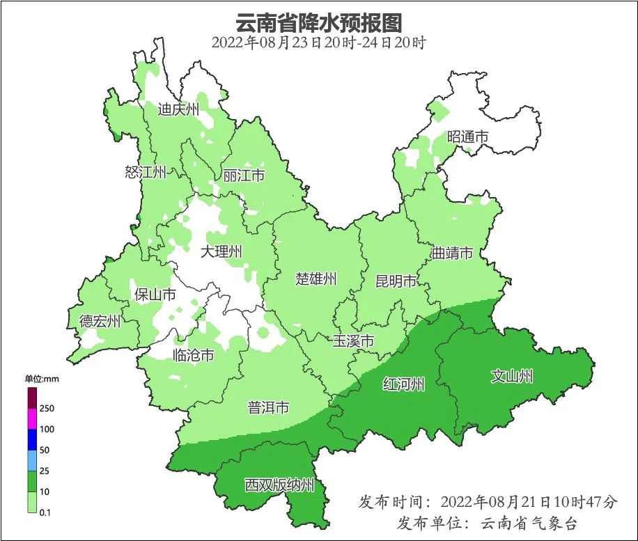 怒江、大理西部、保山、德宏、临沧、普洱、西双版纳、红河南部、文山南部多云有阵雨局部中雨,其他地区多云间晴。