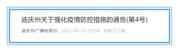 8月23日,迪庆州应对疫情工作领导小组指挥部办公室发布关于强化疫情防控措施的通告(第4号)。详情如下: