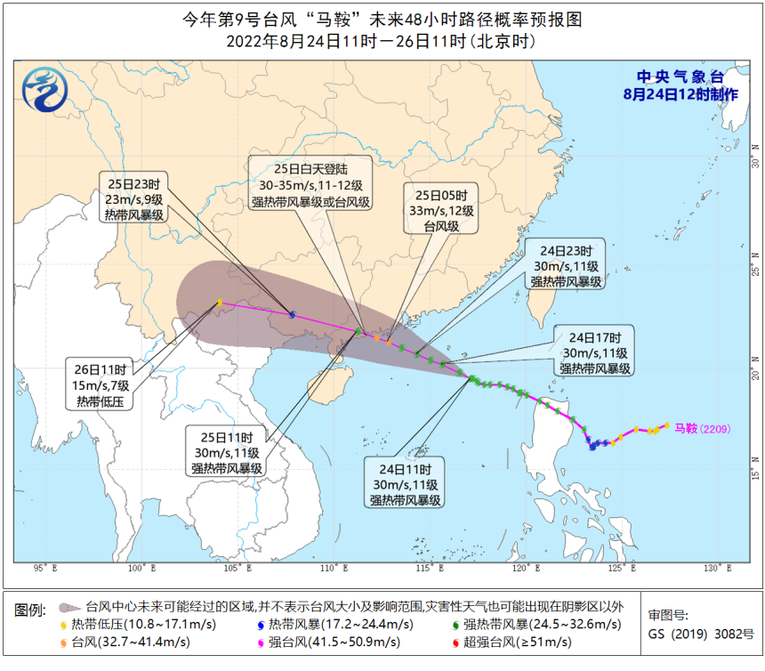 24日至26日,南海中北部、巴士海峡、台湾海峡南部海面、北部湾、西沙群岛附近海域、中沙群岛附近海域以及台湾岛西南部沿海、广东沿海、广西沿海、海南岛沿海将有7至9级大风,“马鞍”中心经过的附近海域或地区的风力可达10至12级,阵风13至14级。