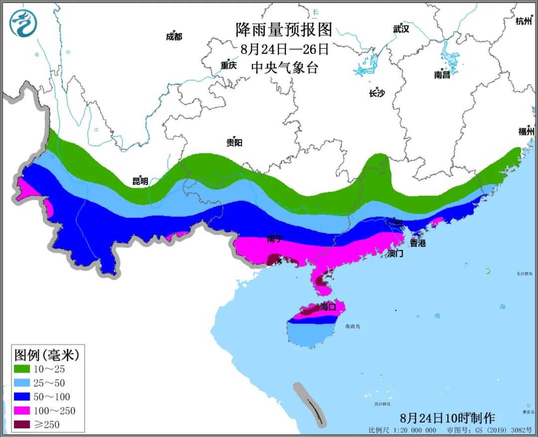 24日至26日,广东中南部、广西中南部、海南岛、云南南部等地将有大到暴雨,其中广东西南部沿海、广西南部、海南岛北部等地有大暴雨,局地特大暴雨(250至300毫米)。
