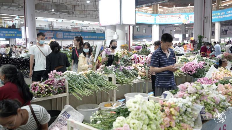 “10块钱4扎,喜欢就多买点,很好养。”商户一边忙着打包,一边招揽着来往的游客。一角钱一支的康乃馨,五角钱一支的玫瑰切花,便宜得让游客感到不可思议。