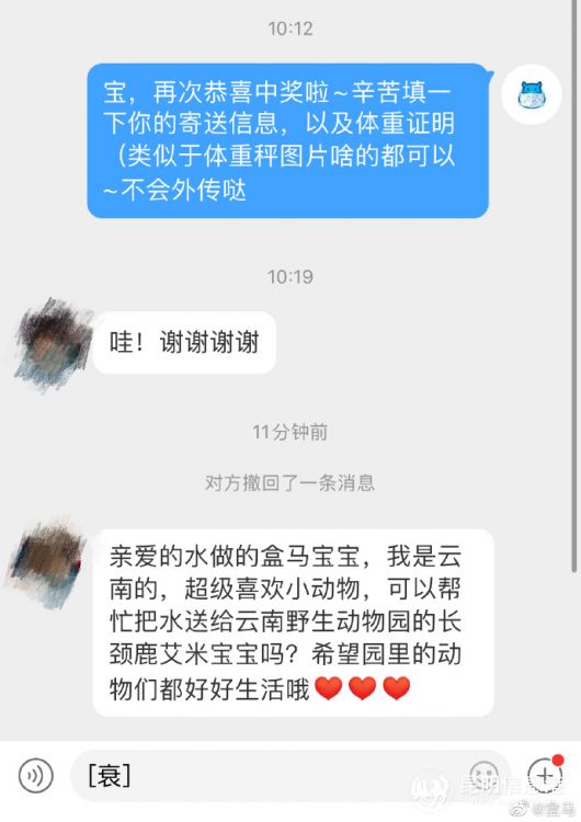 粉丝将水送给云南野生动物园艾米的聊天截图