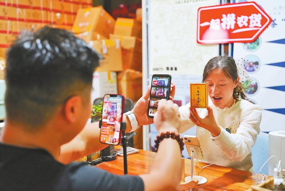 “欢迎各位茶友来到直播间,优惠活动正式开启,今天是‘景迈大树茶’专场。”眼下是传统茶叶销售的淡季,而西双版纳傣族自治州勐海县拼多多商家李玉萍的直播仓库内,却是一派热闹景象。她和丈夫刘国威一边向大家介绍茶叶产品,一边端着茶杯对着镜头展示。刚刚报名拼多多24天“超级农货节”的他们,正在娴熟地通过平台直播间向各地网友介绍云南的普洱茶产品。